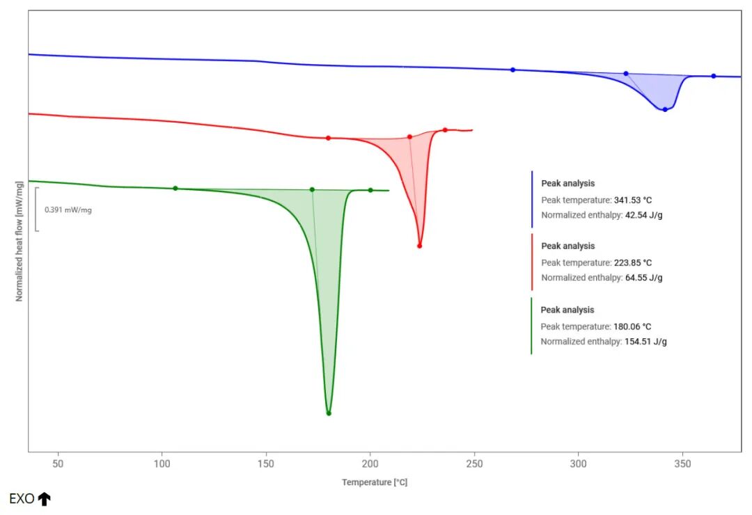 图2:PEEK 熔点值的 DSC热图(蓝色)、PA 6(红色)和POM(绿色)