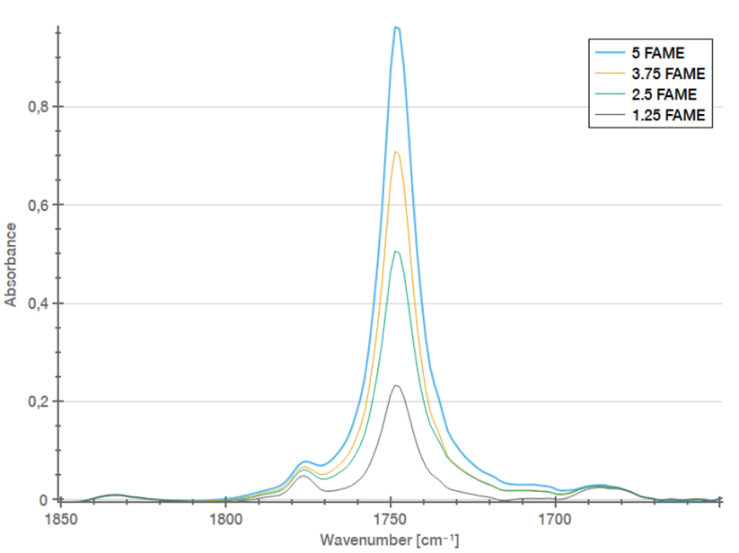 有机物中的官能团在红外光谱中具有特征吸收峰。FAME分子中的酯羰基(C=O)在1745 cm⁻¹附近存在显著吸收,该峰位置明确且不易受其他信号干扰,适合作为定量分析的依据。根据比尔-朗伯定律,吸收强度与浓度成正比,因此可通过该特征峰的强度直接测定FAME含量。FTIR方法无需样品前处理,操作简便、快速。