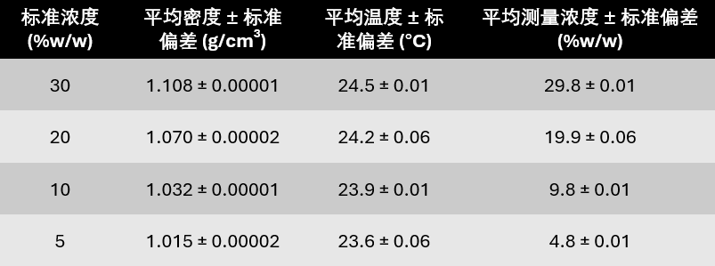 为验证其性能,我们采用50% (w/w) 的双氧水原液,梯度稀释为30%、20%、10%和5% (w/w) 的样品,并使用DMA 35对各浓度点进行三次重复测量。结果如下: