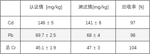 如上表所示,所有测量结果均与标准物质证书上规定认证值一致。Hg加标回收率在96%以上,Pb、Cd、总Cr回收均在97%~110%,六价铬 (Cr (VI))回收率在93%以上